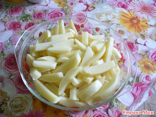 Чистим картофель, нарезаем соломкой, укладываем в посуду для микроволновки