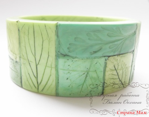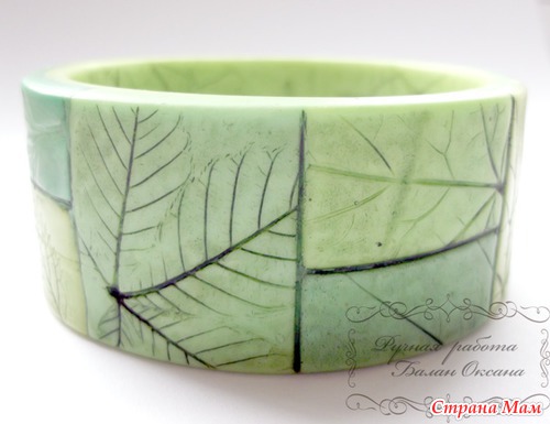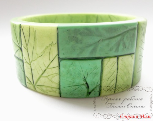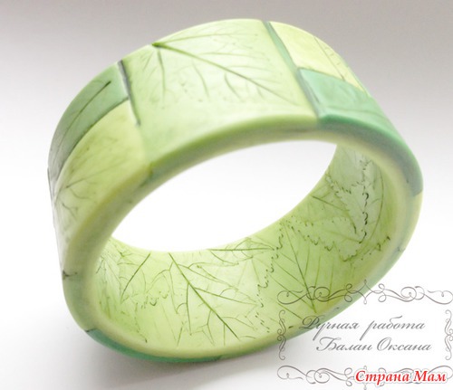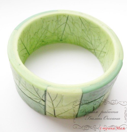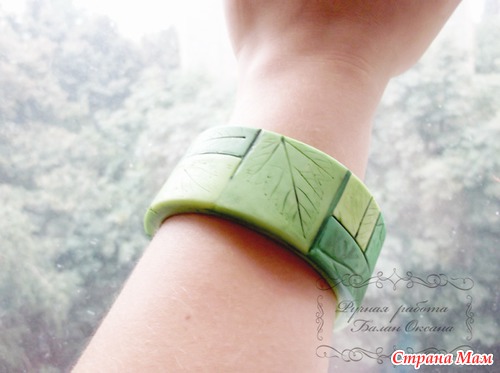Глину использовала только белого цвета, в нее вмешивала пастель разных оттенков и в разном количестве и потом делала отдельные элементы из которых состоит браслет. Всего использовано пять цветов пастели и их смеси. У всех элементов цвета немного отличаются.