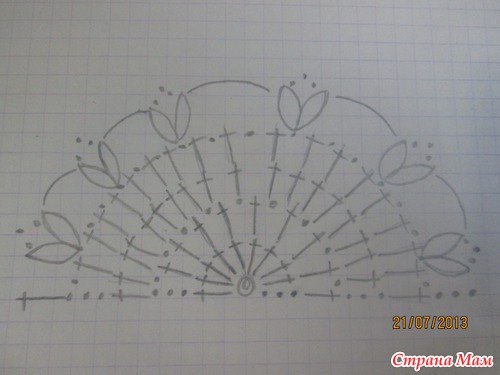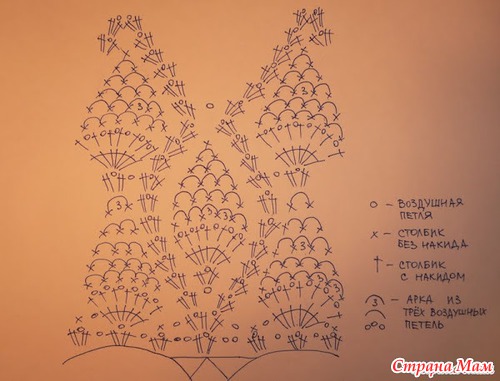 Следующий ряд после черты вяжем по схеме, НО в среднем переднем и заднем ананасах вяжем вместо 7 столбиков с накидом
