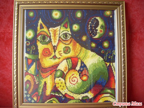 Та рамка, которая сейчас и котику вашему большевата, и стиль у неё совсем другой- более декоративный и закрученный, в неё можно было бы какой то спокойный пейзаж или натюрморт поместить, вышитый в пастельных тонах