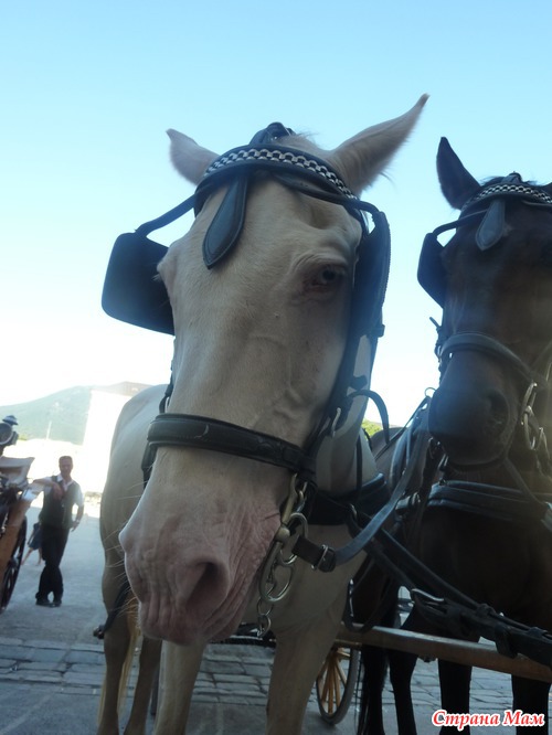 а это уже настоящие лошади... конечно не удержались и прокатились на них.. причем эту двойку ждали специально... уж больно лашади понравились... как рассказал повозчик - та что белая, ей 22 года - какая то редкая русская порода или привезена из России.. а второй жеребчик, 7 лет... просто жеребчик...