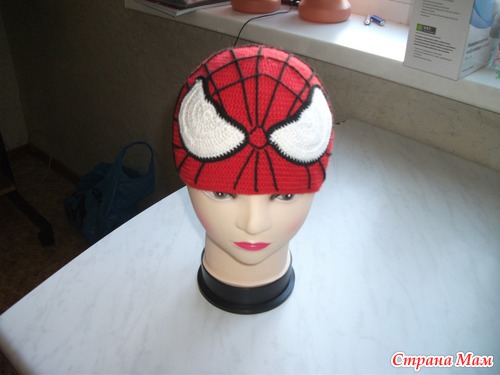 Глаза вязала по схеме, скину вам в личку. А паутину делала,как усики у кошки: двойная нить,выводила на лиц сторону и скручивала по направлению скручивания пряжи,чтобы получилась одна нить и выводила где надо на изнанку.Шапочка обычный калпачок. Если непонятно обьяснила,то напишите попробую по другому)))