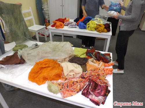 Оксана принесла МНОГО ООООЧЕНЬ много шерсти и шелка, так что мы много времени потратили, чтобы сделать выбор. Вот наши "кучки"...