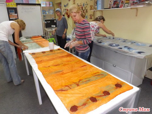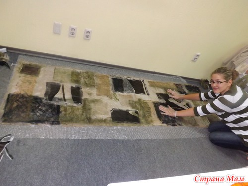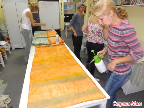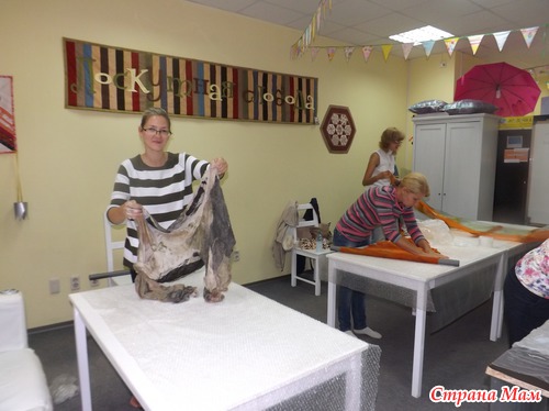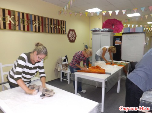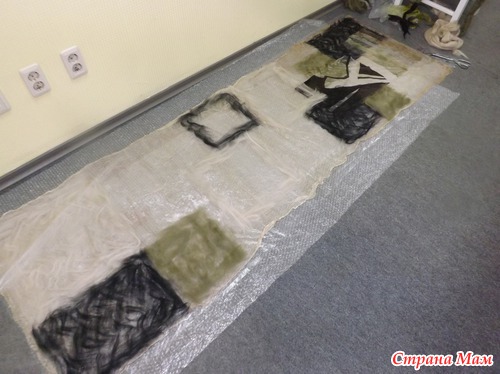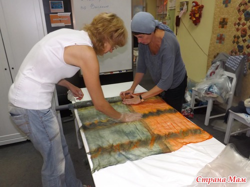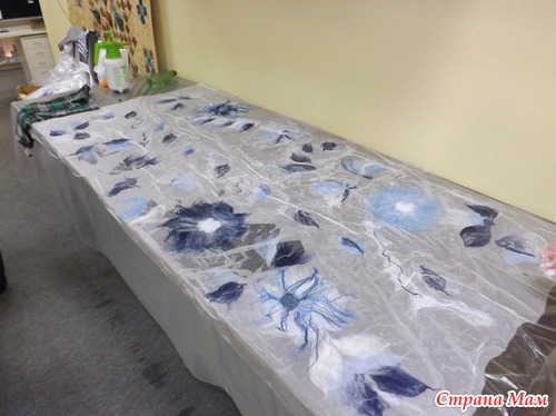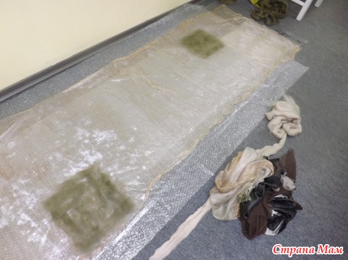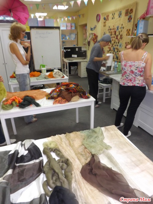 Места для валяния палантина надо много, и, хотя нас было 4 человека, его не совсем хватало, так что решила уютно расположиться на полу, тем более, что я привычная (дома тоже люблю на полу раскладываться со своим рукоделием