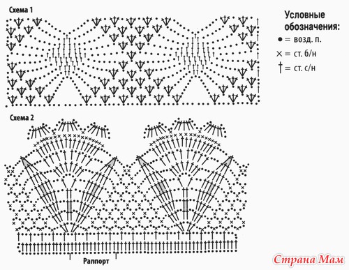 Изделие вяжется по кругу. Наберите цепочку из 190 возд. п. крючком №2,5, замкните в кольцо. Вяжите ст. б/н, провязывая в начале каждого ряда 1 возд. п. для подъема. Провяжите таким образом 10 см. После этого поменяйте крючок на №3 и в следующем ряду равномерно прибавьте 70 п. Далее вяжите ажурным узором по схеме 1. На высоте 15 см от начала узора поменяйте крючок на №4 и продолжайте вязать ажурным узором. На общей высоте 48 см свяжите кайму по схеме 2. С внутренней стороны пояса пришейте широкую резинку.