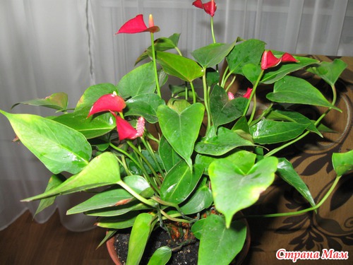 Антуриум купила цветущим прошлым летом, думала отцветёт и... можно справить поминки (был печальный опыт), но нет мы нашли с ним общий язык и вот он во всей красе. Это уже МОЁ цветение. Только мелковат он у меня, наверное сорт такой.