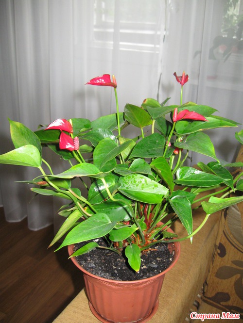 Антуриум купила цветущим прошлым летом, думала отцветёт и... можно справить поминки (был печальный опыт), но нет мы нашли с ним общий язык и вот он во всей красе. Это уже МОЁ цветение. Только мелковат он у меня, наверное сорт такой.