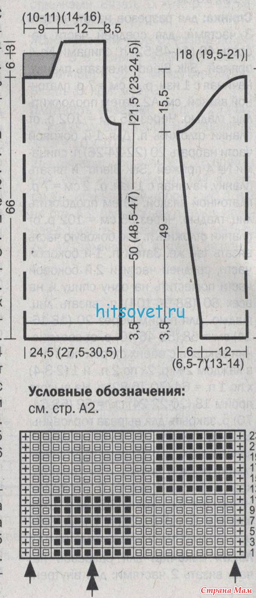 Плотность вязания: 17,5 п. и 23 р. шахматного узора спицами № 5,5 = 10 х 10 см; 19 п. и 23 р. резинкой спицами № 5,5 = 10 х 10 ст.