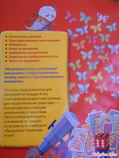 Интересное, красочное пособие на развитие мыслительных и логических способностей школьников. В силу того, что книга написана зарубежным автором, тематика заданий соответствующая, но это можно отнести к плюсам, т. к. у ребенка значительно расширятся познания о традициях и особенностях культуры народов разных стран. Книга разделена на три части: кругосветное путешествие, путешествие в мир животных и путешествие в историю. Для решения некоторых заданий, возможно, понадобится обращение к словарям и энциклопедиям, а также пригодятся дополнительные материалы, например, спички или счетные палочки, и т. к. уровень сложности их довольно серьезный)), ну и запаситесь терпением и бумагой с карандашом, так как сказано в предисловии, часто сообразительность не зависит от возраста и порой дети обыгрывают своих мам и пап!