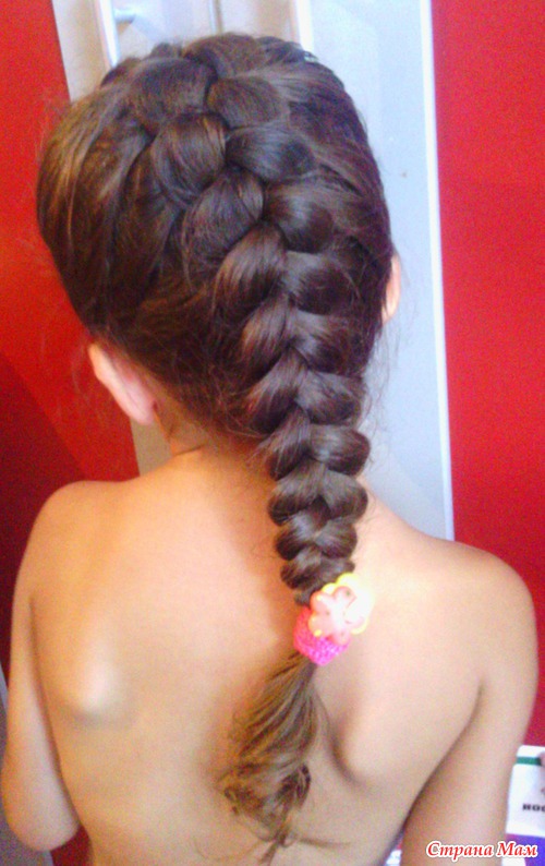 французская коса с лентой, впервые делала, у дочки мало волос для нее, если у Ваших девочек волосы длинные и густые, то очень красиво получается)