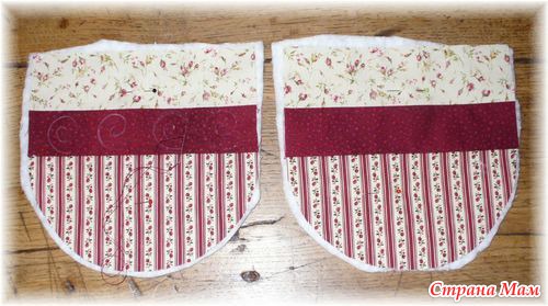 2. Сшиваем вместе лоскутки для основной детали «чашки», вырезаем 2 основные детали из ватина. Лоскутную деталь накладываем изнаночной стороной на ватин и делаем декоративную стежку:
