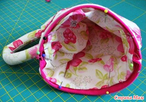 5. Теперь сшиваем нашу сумочку: складываем детали лицом к лицу, следя за тем, чтобы слои ткани не смещались. Скрепляем булавками или на живульку и прострачиваем, прихватывая в шов ручку чашки. Выворачиваем на лицевую сторону.