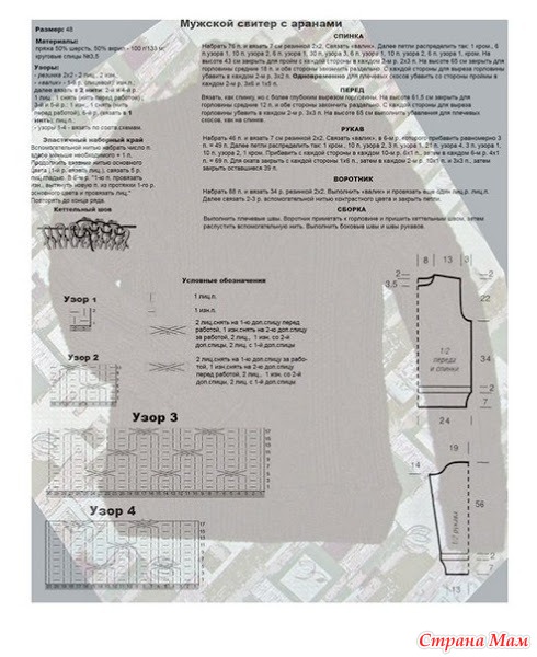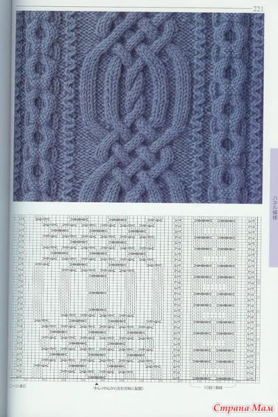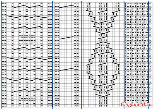 4 - "центральный аран" 21 петля: горизонтальные черточки-изнаночные петли, пустые клетки-лицевые,