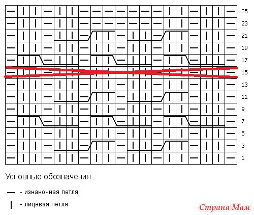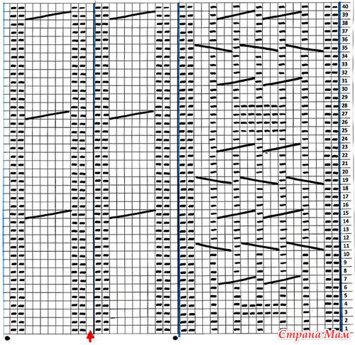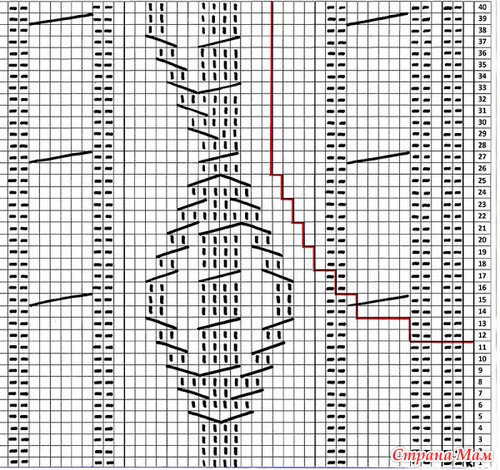 - "жгут" (12п., его последняя лицевая петля является серединой, на схеме обозначена красной стрелкой) далее симметрично.