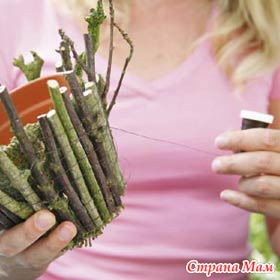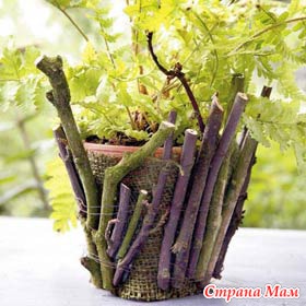 Теперь на чистый горшок клеим мешковину, а на нее – ветки. Ветки-прутики можно укладывать плотно или нарочито небрежно – как заблагорассудится. Готовую конструкцию обматываем для надежности проволокой.