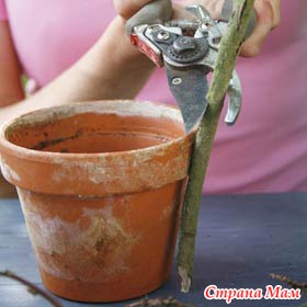 Способ второй: а-ля натюрель. Для оформления терракотового горшка в таком дико-природном стиле потребуются ветки примерно с палец толщиной (можно тоньше), кусок джутовой мешковины, клей в пистолете и тонкая проволока. Вырезать кусок мешковины по размеру горшка. Секатором нарезать веточки: длина примерно равна высоте цветочного горшка.
