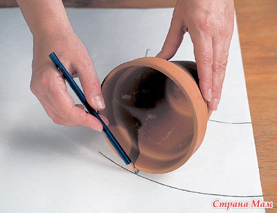 Способ третий: универсальный. А именно, оклеивание тканью. Немного кропотливого труда, и цветочный горшок, точь-в-точь вписывающийся в стиль вашей квартиры, будет готов. Помимо горшка, нужны будут карандаш, ножницы, лист бумаги (газетная тоже сойдет), ткань для отделки, клей ПВА и кисть. Для начала делаем бумажную выкройку: рисуем на боку горшка вертикальную линию, кладем горшок на бумагу так, чтобы линия и край бумаги совпали. Теперь «прокатываем» горшок по бумаге, при этом обводим его нижний и верхний край карандашом – должна получиться развертка, как на фото. С газетной бумагой проще: просто обворачиваем лист вокруг горшка, оставляя бумагу ровной на его боках и обминая ее по краям. Расправляем лист и вырезаем гладкий, не помятый, участок.