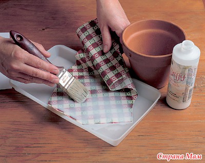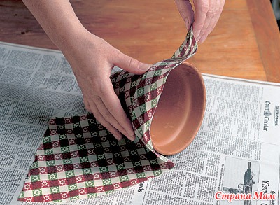 По бумажной выкройке вырезаем деталь из ткани, не забываем прибавить припуски 2-3 см вверху и внизу. И ткань, и сам горшок перед их соединением нужно прогрунтовать. Разводим для этого клей ПВА с водой 2:1, промазываем горшок. Немного клеевого состава распределяем и по тканевой детали (это удобно делать, положив ткань в большой таз или на противень). Избыток клея должен стечь, но материал при этом выжимать нельзя.
