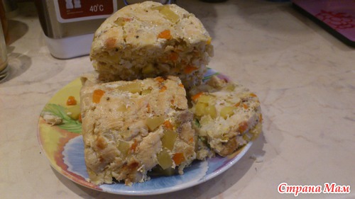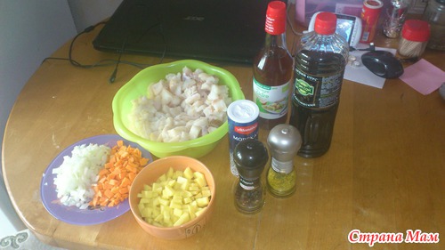Нарезаем мелко лук, картофель и морковь режем небольшим кубиком и добавляем овощи к рыбе. Добавляем приправы, яблочный уксус и соевый соус, немного подсаливаем (аккуратнее, так как соевый соус уже соленый) и хорошо перемешиваем. Затем добавляем пачечку желатина и снова перемешиваем. Удобнее всего это делать руками.