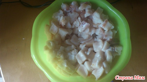 Рыбу нарезаем произвольно, но не крупно. Предварительно освободив филе от кожи и косточек. Складываем в миску.