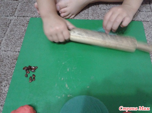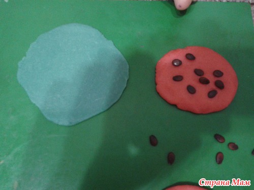 "Арбуз" и "конфетки". Лепили из домашнего пластилина. Дочь раскатала лепешки и втыкала настоящие семечки арбуза