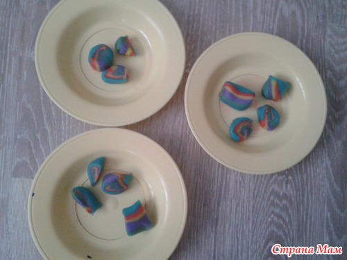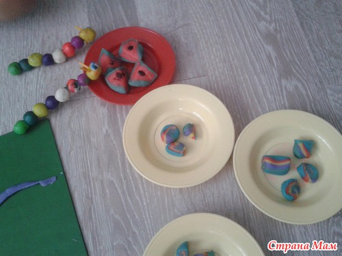 ВЫрезали формочкой круги разного цвета. слепили между собой. Затем раскатали колбаску и так же нарезали.