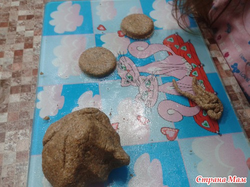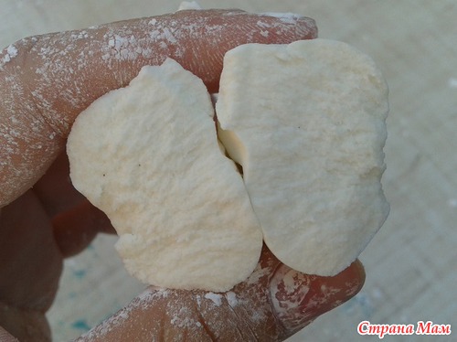Лепили несъедобные печеньки. Смешала ПВА, "ракушечник" (привозила с моря), можно обычный просеянный песок и немного масла подсолнечного. Получилось вот такое тесто, отлично массирует и заодно "скрабит" ручки)
