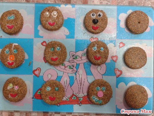 вырезали "печеньки" как обычно из теста для лепки и украшали их)))