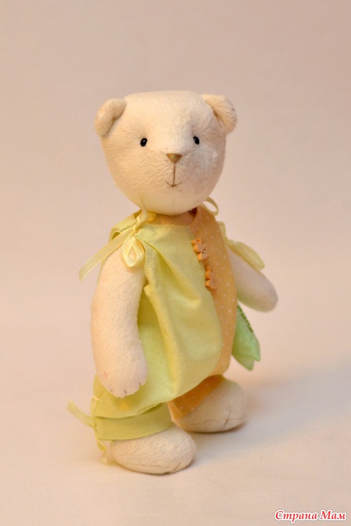 Мишка в стиле Тедди, сшит из плюша молочного цвета, шплинтованное крепление головы, ножек, ручек, для набивки использовала синтепух и стеклянный гранулят (поэтому идет как подарок маме