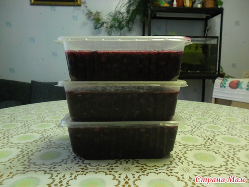 Ягоды давлю или чуть-чуть блендером, потом пересыпаю с сахаром и ночь они стоят, чтоб сахар растворился!!! Утром раскладываю в контейнеры и в морозилку!!!