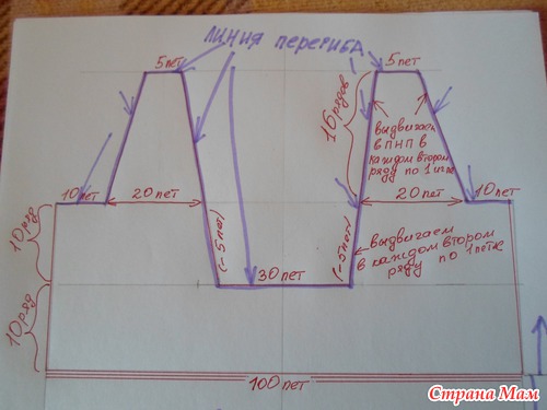 С левой стороны вязала еще 10 рядов прямо, а с правой стороны выдвигала в ПНП по 1 игле в каждом втором ряду.