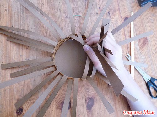 Смотрите, сначала - солнышко из картона. Два круга - внутренний и внешний. На внешнем на одинаковых растояниях друг от друга отмечаем 1.5- 2 см полоски. Таких полос будет откло 30-32. Вырезаем лучики.