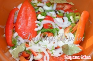 В миску (или банку) сложить перцы, лук, зелень, чеснок. Перемешать.