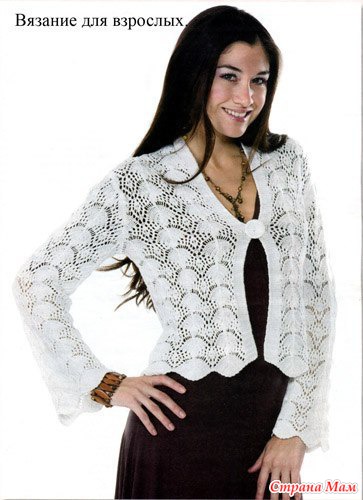 Правую полочку связать симметрично левой. Возобновить вяз. 115 п. спинки, закрывая для пройм с обеих сторон в каждом 2-м р. 3 п. и 2 п.