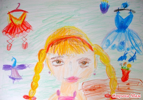 А рисовала она свой портрет! И когда я предложила ей нарисовать то, о чем мечтаешь, потому, что портрет получился очень мечтательный, девочка с удовольствием принялась рисовать наряды для балета. Создавая и усиливая образ.