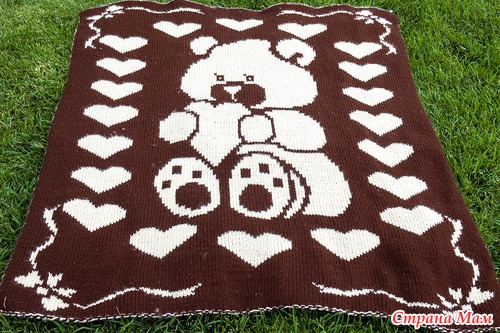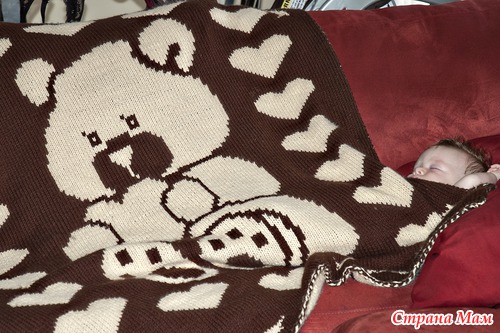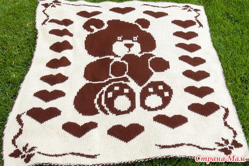 Связала внуку одеяло. Спицы №4, нитки Bernat бежевые на 300гр 984 метра и коричневые Red Hart with Love на198 гр 338 метров, тех и тех ушло по 850 метров. Схему взяла в интернете, немного ее подправив.