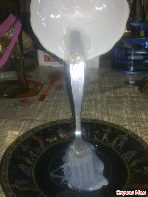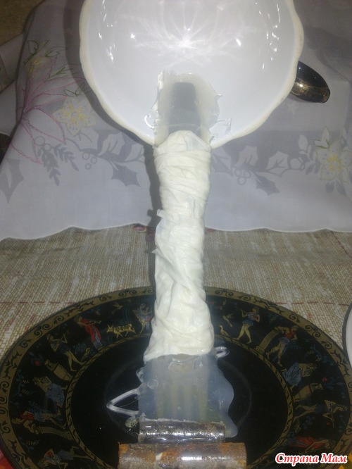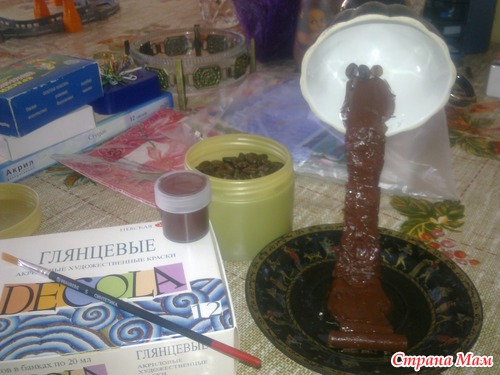 когда все плотно скрепилось, на вилку намотала бумажное полотенце смоченное в клее ПВА разведенным 1:1 с водой, для придания формы нашей струйке кофейных зерен. И грузики приклеила на блюдце, так как чашка перевешивала и моя конструкция падала