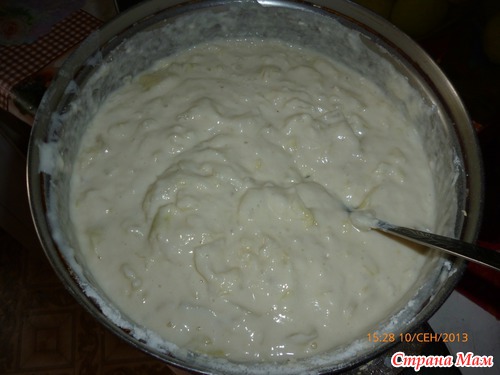 Консистенция теста должна получиться гуще чем на оладьи, тесто не должно стекать с ложки, а как-бы "шлепаться" с него. Поэтому муку добавляем постепенно, у меня ушло сегодня ушло половина пакета(1кг), где то грамм 500-600.