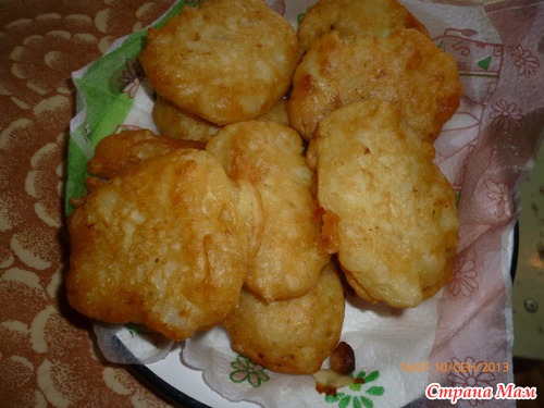 После этого нагреваем растительное масло в сковороде, примерно 2см от бортика, как для жарки пончиков и когда оно раскалилось, начинаем жарить.