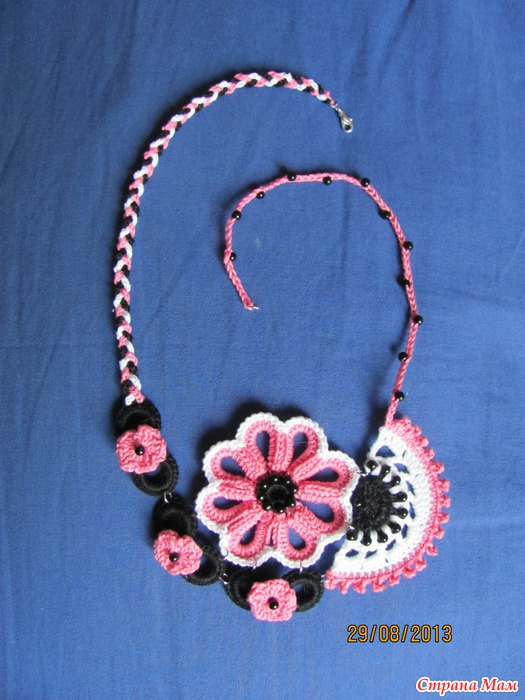 У моего мужа и жены его брата Дни Рождения в один день. Чтобы просто не обмениваться деньгами, решила связать какую-нибудь безделицу. Выяснилось, что Ирине нравится бижутерия, сразу слазили в интернет (чтобы я голову не ломала). Выбрали, благо схема тоже нашлась, правда на испанском.