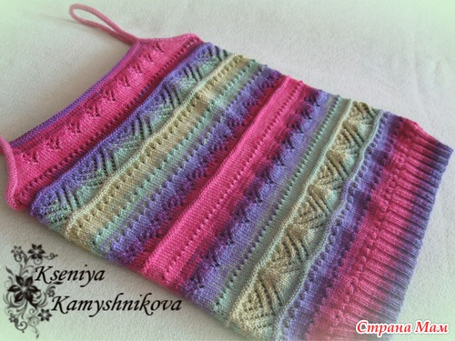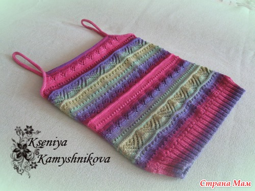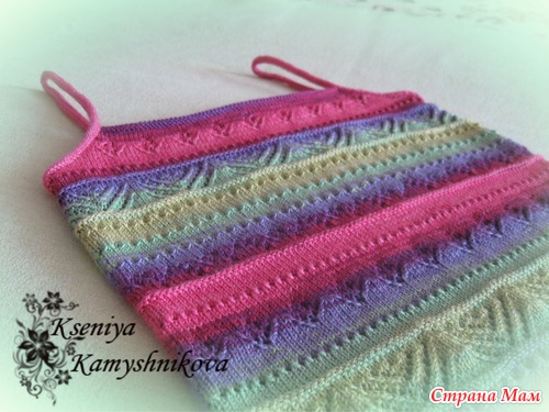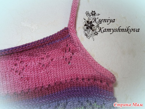 По проймам прошлась тамбурным швом крючком, набрала воздушные петли на лямки и прикрепила к началу, потом на круговые спицы набрала петли и вязала изнаночными, краешек завернулся и все ненужное спрятал :
