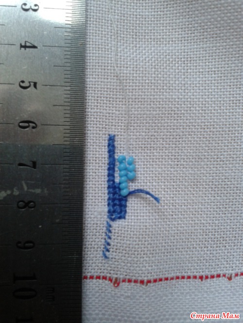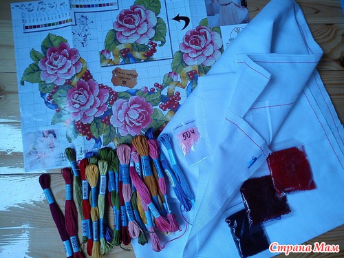 Купилала домотканное полотно, схему, мулине перевела в гамму. Хотела сначало вышить всё бисером, но девочки из группы сказали, что будет тяжеловато. Поэтому вышью бисером только ягоды. Всё готово, но начать не решусь. С чего начать? Нужна выкройка. И попробовала вышить несколько стежков и бисеринок.
