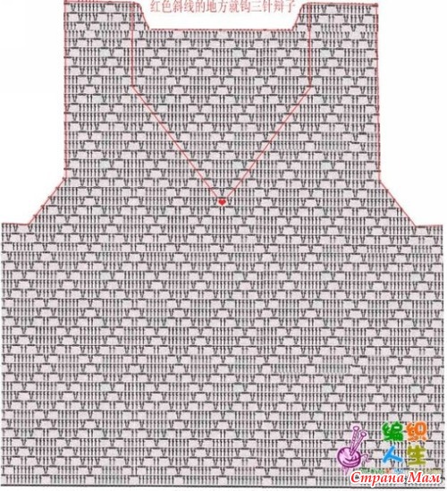 Нитью сине-зеленого цвета крючком № 3,5 набрать цепочку из 61 в. п. и вязать узором по схеме, соответственно чередуя цвет нити. На высоте 23 см убавить для пройм с обеих сторон