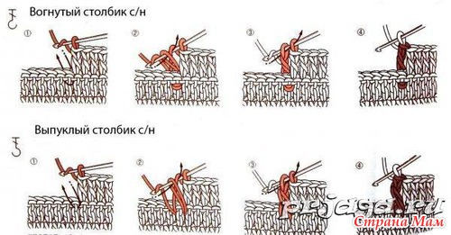 Вяжется шарф снуд крючком из шерстяной пряжи 2 ply. Основной узор составляют выпуклые и вогнутые столбики с/н. Как их вязать вы можете посмотреть на рис. после описания.