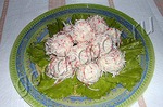 Если вместо крабовых палочек используются креветки, то их отварить 3~5 мин в подсоленой воде, остудить и мелко порезать.