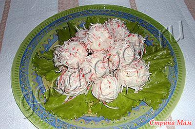 Так как сырная масса получается довольно липкой, то можно налить в миску теплую кипяченую воду и после каждого шарика ополаскивать там руки. Влажными руками гораздо легче лепить шарики и они потом получаются слегка мокрыми и на них больше налипает крабовой стружки.