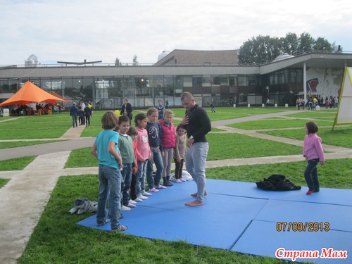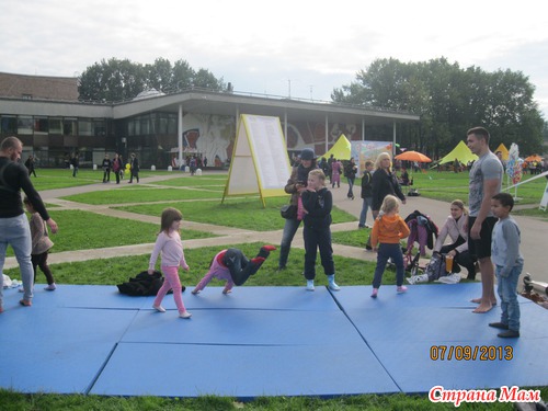 А здесь расположились юные акробаты и желающие себя попробовать. Несколько матов и тренер - что ещё нужно детишкам для валяния, прыжков и кувырканий!
