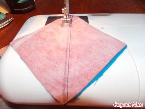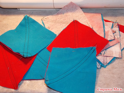 выкроили квадраты, начинаем сшивать, налаживаем квадрат на квадрат лицевими сторонами внутрь,