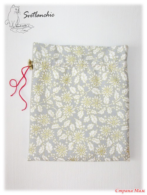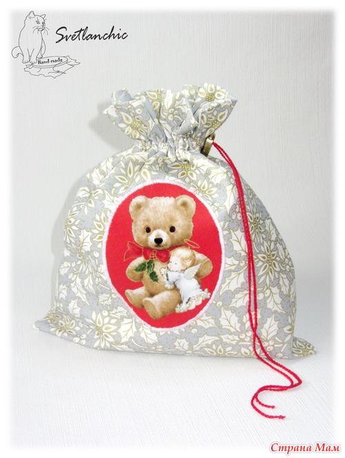А компанию ему составит новогодний мешочек с милым плюшевым мишкой. Ширина мешочка - 23 см, высота - 26 см, высота под подарок (до кулиски) - 21 см