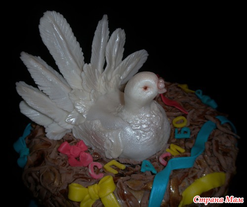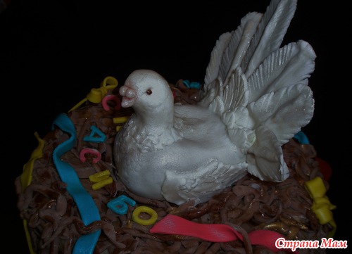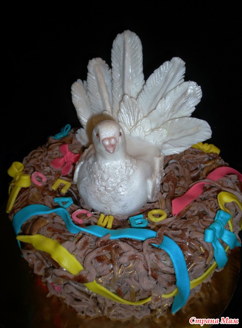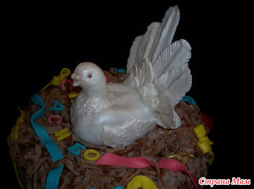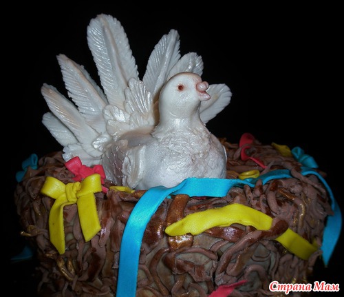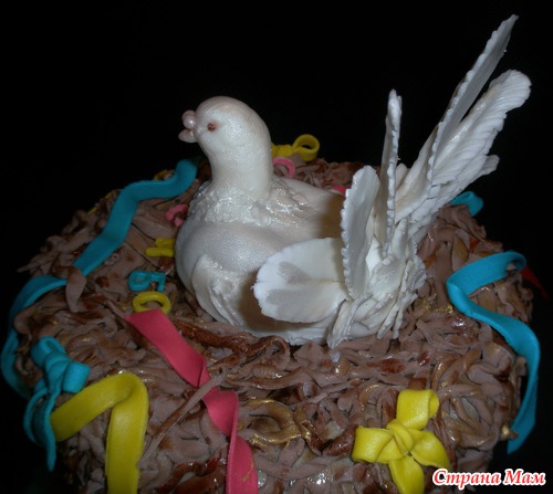 Шококипяток, заварной шококрем, бананы, полуганаш под мастику, мастика молочная и офигительная, в теле голубки картошка кондитерская. В знак благодарности персоналу Д/С "Голубок". Муж мой сказал, что - енто курица... Гнездо страшноватое вышло... Читать полностью